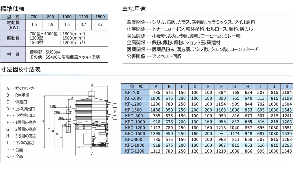 円型振動(dòng)ふるい機(jī)が開(kāi)発されて以來(lái)、現(xiàn)在も一般的に使用されているスタンダードな機(jī)種です。あらゆる業(yè)種においてふるい選別に責(zé)獻(xiàn)、とくに濕式用途で多く利用されています。KFシリーズは乾式·濕式いずれでも簡(jiǎn)単に使用でき、振動(dòng)ふるい機(jī)各シリーズの中でも最もリーズナブルなタイプです。