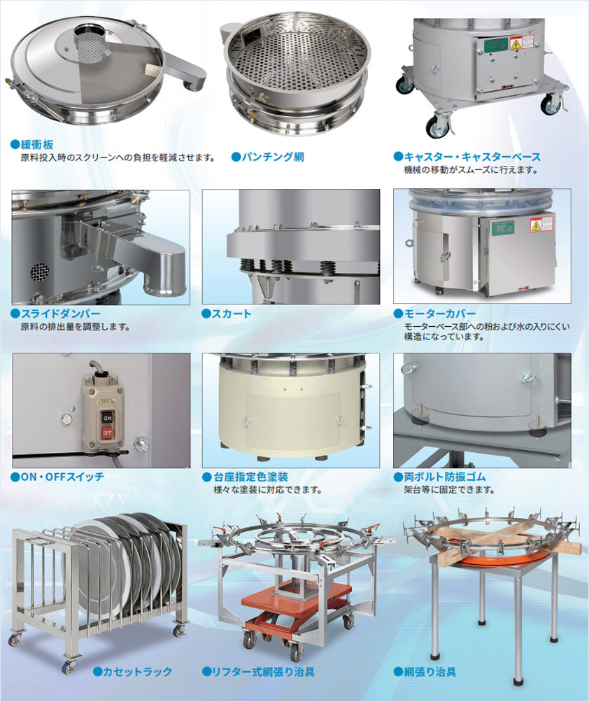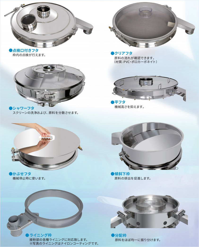 オプション Option KOWAでは振動(dòng)ふるい機(jī)のベース製品に対応可能な各種オプション品をご用意。作業(yè)條件や使用環(huán)境に合わせて、必要な用途のオプション品をお選ひいただくことで、より便利·快適に作業(yè)効率を向上させることができます。