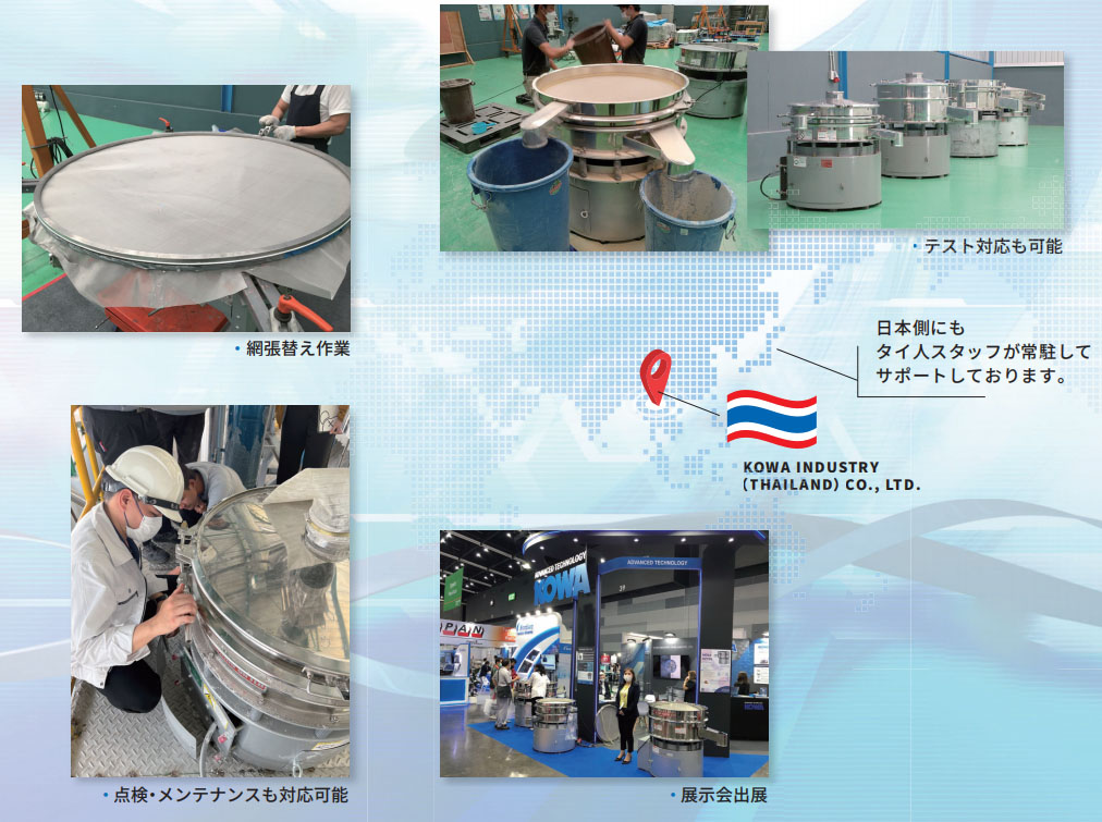 タイ王國(guó)バンコク郊外に位置し、タイ國(guó)內(nèi)でのメンテナンス業(yè)務(wù)を始め、アジア圈での販売拠點(diǎn)として2016年3月に設(shè)立致しました。2020年からはタイでのふるい機(jī)組立を開始し、海外でも安心してご使用いただける環(huán)境作りをしています。これからも海外で“日本と変わらぬサービス”を目指して參ります。