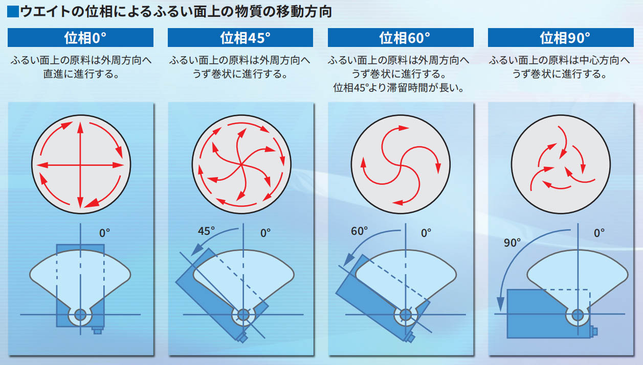 そして、振動體に上下のウエイトをつけることで、水平·垂直·斜めの動きの3次元運動が可能になり原料の性質(zhì)に合わせた処理ができます。