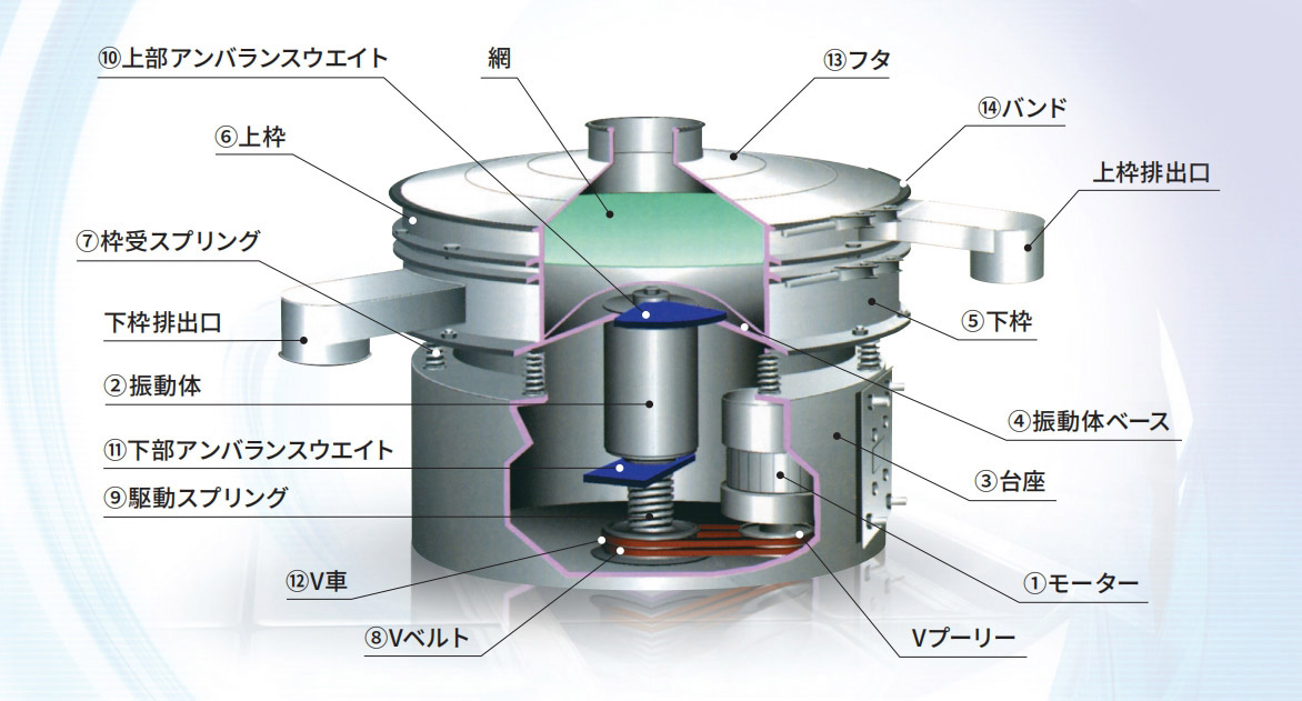 一般的にふるい分けの基本は、網(wǎng)を振動させることによって、原料の粒の大きさを選別したり、異物の除去を行います。振動ふるい機(jī)の運動原理は、モーターおよび振動體によって水平·垂直·斜めの動きを発生させ、網(wǎng)上の原料を効率よくふるい分けするものです。加えて、振動體に取りつけたウエイトの位相調(diào)整によって、ふるい面での原料の流れ具合を最適コントロールすることができ、ふるい分けの原料(粒度·比重等)に合わせた効率の良いふるい分けを可能にしています。