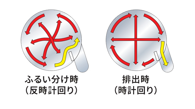 リバース機(jī)能では、ふるい分け時(反時計回り)と排出時(時計回り)とで原料の流れを逆転させ、その繰返し運転を行うことによって、最も効率的に95%以上の完璧に近いふるい分け・排出を可能にしました。