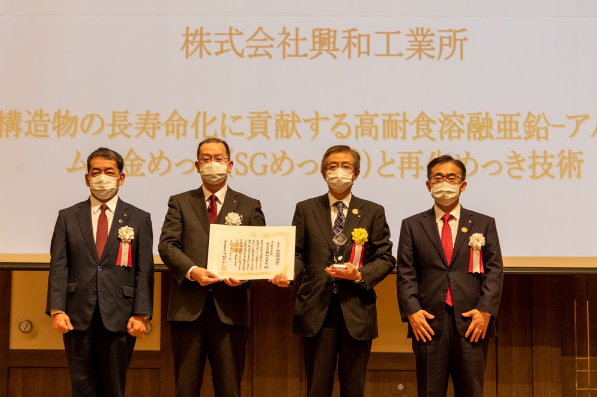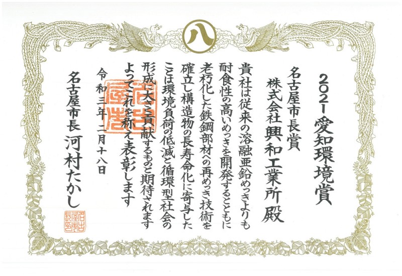 興和(山東)機械有限公司的日本本社株式會社興和工業(yè)所于2021年2月18日榮獲2021年度愛知縣環(huán)境保護獎。茲用來表彰株式會社興和工業(yè)所不同于一般的鍍鋅工藝,在研發(fā)使用高耐腐蝕性電鍍技術的同時,通過對老化鋼材的再電鍍技術,實現(xiàn)了構造物壽命的延長,對環(huán)境保護及構建循環(huán)型社會做出了重大貢獻。